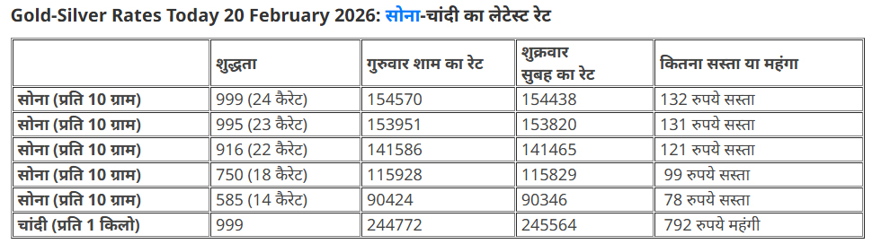 नई दिल्ली : भारतीय सर्राफा बाजार में हफ्ते के आखिरी कारोबारी दिन आज (शुक्रवार) सोने की कीमत में गिरावट दर्ज की गई है. लेटेस्ट रेट के मुताबिक, 24 कैरेट वाले शुद्ध सोने का कीमत अभी भी 1 लाख 54 हजार रुपये प्रति 10 ग्राम के पार है. वहीं, 20 फरवरी 2026 को चांदी फिर 2 लाख 45 हजार रुपये प्रति किलो से ऊपर पहुंच गई है.