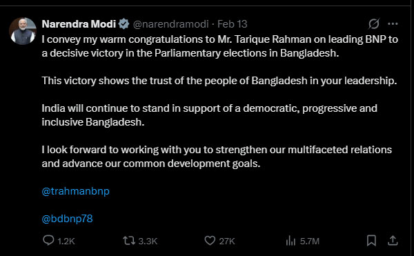 पीएम मोदी ने सोशल मीडिया प्लेटफॉर्म एक्स पर तारिक रहमान को बधाई देते हुए लिखा, 'मैं तारिक रहमान को बीएनपी का नेतृत्व करते हुए बांग्लादेश के संसदीय चुनावों में जीत हासिल करने पर हार्दिक बधाई देता हूं. यह जीत आपके नेतृत्व में बांग्लादेश की जनता के विश्वास को दिखाती है.'